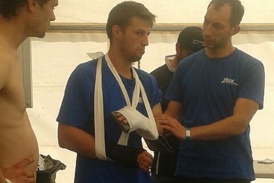 Le week end dernier avait lieu le 5 eme Grand Prix de la saison en Ukraine à une dizaine de kms de KIEV où uniquement 24 équipages ont fait le déplacement pour cette course. Tout juste rentré après presque 3000 kms. Un long voyage qui n’a pas été payant pour le TGM, 4 eme des essais libres ,le TGM n’était pas dans un bon rythme sur une piste que les pilotes trouvaient très piégeuse, la séance suivante était les essais chronométrés, lors du 3 eme tour le TGM se lance dans un tour chrono, la vitesse était meilleure, sur un appel de saut ,le sidecar n°4 part en travers et se pose sur le cale pied à la réception ,la chute est inévitable. Les pilotes se relèvent ,Andres est indemme, Valentin a mal aux deux mains. Le sidecar serait retombé sur ses mains, l’annulaire gauche luxé , le médecin lui remet immédiatement sur place, une douleur au poignet droit, nécessite un examen pour vérifier si rien n’est fracturé. De retour de l’hôpital de KIEV deux heures après ,les résultats sont plutôt bons, aucune fracture n’a été décelée. Le TGM n’est pas qualifié pour la course de dimanche suite à son absence lors des qualifications, mais le jury se réunit et décide de faire participer le TGM à la course étant donné que le nombre maximum de 30 pilotes n’ai pas atteint, le duo Franco Germanique aura la possibilité de courir dimanche si la santé le permet ,consigne du médecin.. Après une bonne nuit de récupération, le médecin ausculte Valentin et lui donne le feu vert ,le TGM se lance donc pour le warm up, une séance pour voir s’ il sera possible de courir dans l’après midi , vu que la douleur au poignet est présente et gênante. Après 30 minutes d’essai ,le TGM doit déclarer forfait pour la course , la douleur est trop importante pour pouvoir rouler sérieusement. La déception pour le Team, mais quand c’est pas possible ,c’est pas possible.