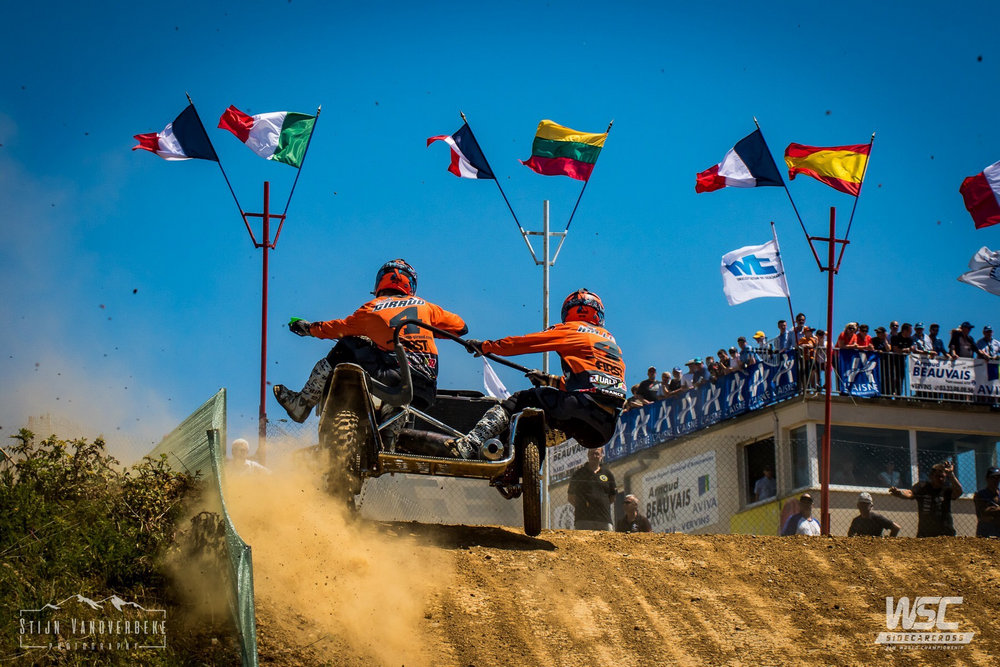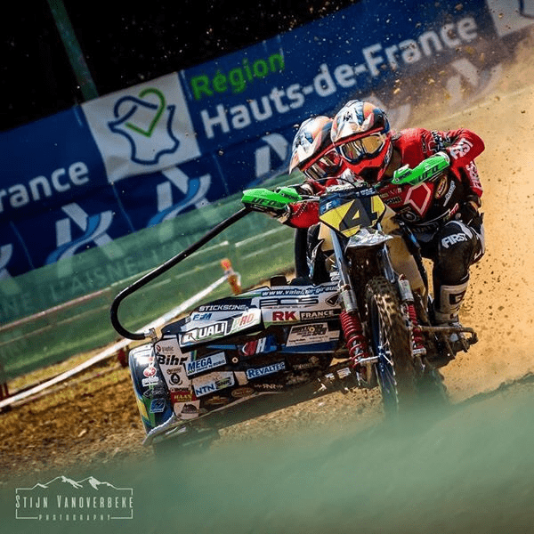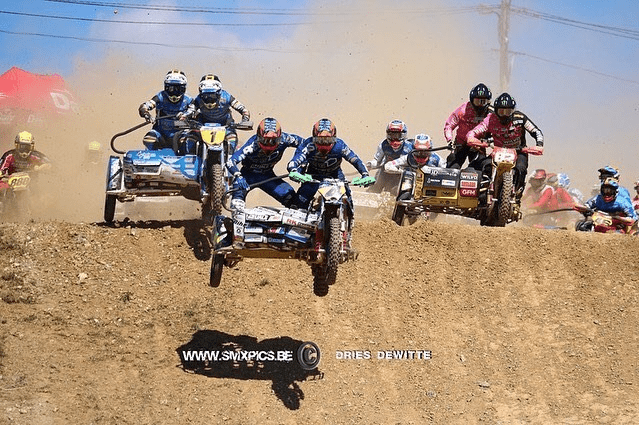 16h 2ème manche Le TGM a pris une sérieuse option pour la victoire de Grand-Prix mais doit réaliser une bonne seconde manche. Le départ est donné, le sidecar N°4 sort comme une fusée de la grille de départ. Au premier virage le TGM est en tête suivi de Bax, Vanluchene, Dierckens, et Hermans. Le TGM est sous pression, mais doit gérer sa course. Après 3 tours le Hollandais Bax et le Belge Vanluchene sont passés. Le TGM est 3ème, Dierckens et Hermans poussent , le TGM doit s’incliner et se retrouve 5ème, aïe aïe!!! A mi-course Bax est en tête tout seul, Hermans a passé Vanluchene et est 2ème à 10 secondes, Vanluchene 3ème, Dierckens 4ème est talonné par le TGM qui a retrouvé de nouvelles forces dans cette deuxième partie de manche. Dierckens ne peut contenir les assauts du Français et se fait passer. Le TGM est 4ème à 5 tours de la fin, les places sont figées et ne devraient plus changer. On rentre dans l’avant dernier tour, le Belge Vanluchene est 3ème, mais sur l’appel d’un saut le passager du sidecar N°1 tombe du panier et le sidecar part en tonneaux à la réception. Plus de peur que de mal mais Vanluchene doit abandonner . Le TGM prend la 3ème place de la manche et remporte le Grand-Prix